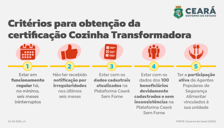 O programa Ceará Sem Fome, criado em 2023, é uma política pública do Governo do Estado, com três frentes emergenciais: uma rede com mais de 1.300 cozinhas sociais, responsáveis por servir mais de 130 mil refeições diárias; o Cartão Ceará Sem Fome, no valor de R$ 300, que beneficia mais de 47 mil famílias; e campanhas solidárias que já arrecadaram mais de 500 toneladas de alimentos em grandes eventos.