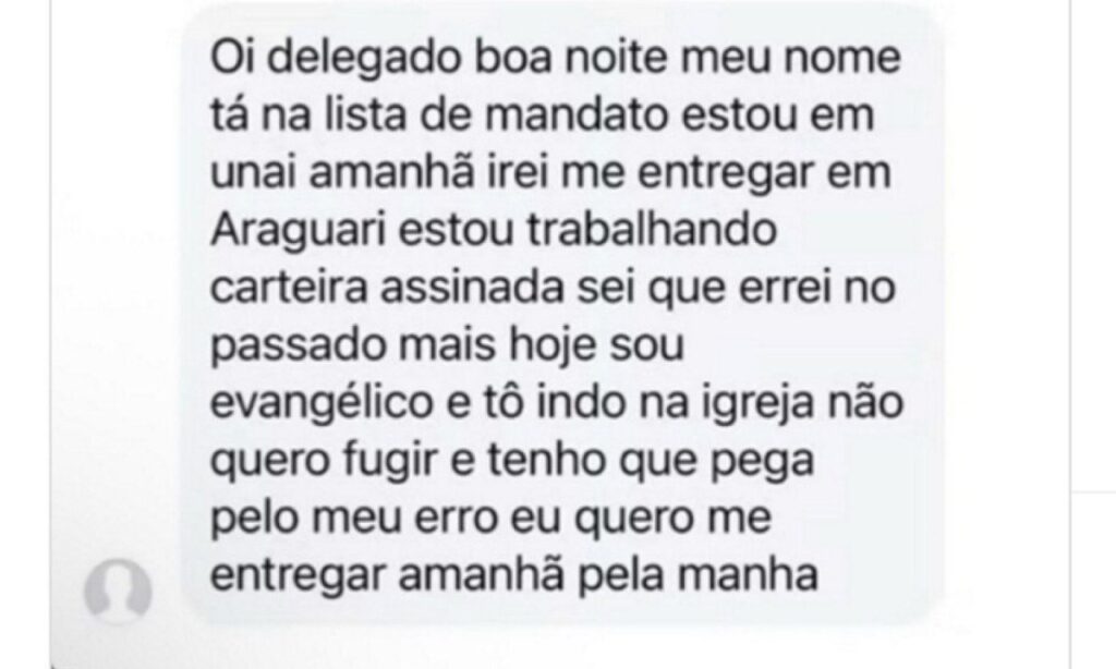 Um jovem de 23 anos, que era procurado pela polícia por suspeita de associação criminosa, mandou uma mensagem para o delegado Fernando Storti nessa quinta-feira (21/8) afirmando que queria se entregar. No texto, enviado e também divulgado no Instagram, ele diz que atualmente é evangélico e precisa “pagar pelo erro”. O homem estava na cidade de Araguari, no Triângulo Mineiro.